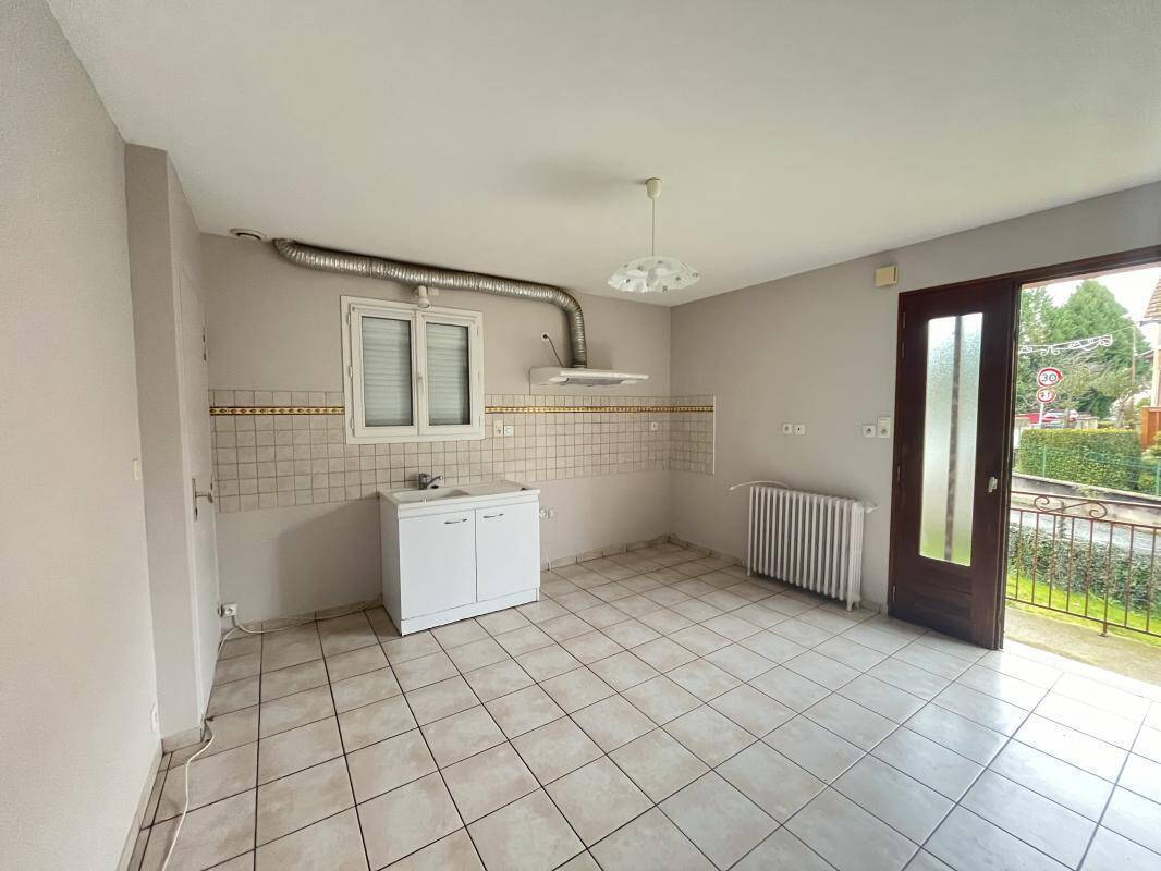 Une cuisine américaine avec hotte, placard technique, un séjour, une chambre, une salle d'eau avec lavabo, cabine douche et wc. Garage au -1 et petit terrain. Chauffage individuel au fuel.